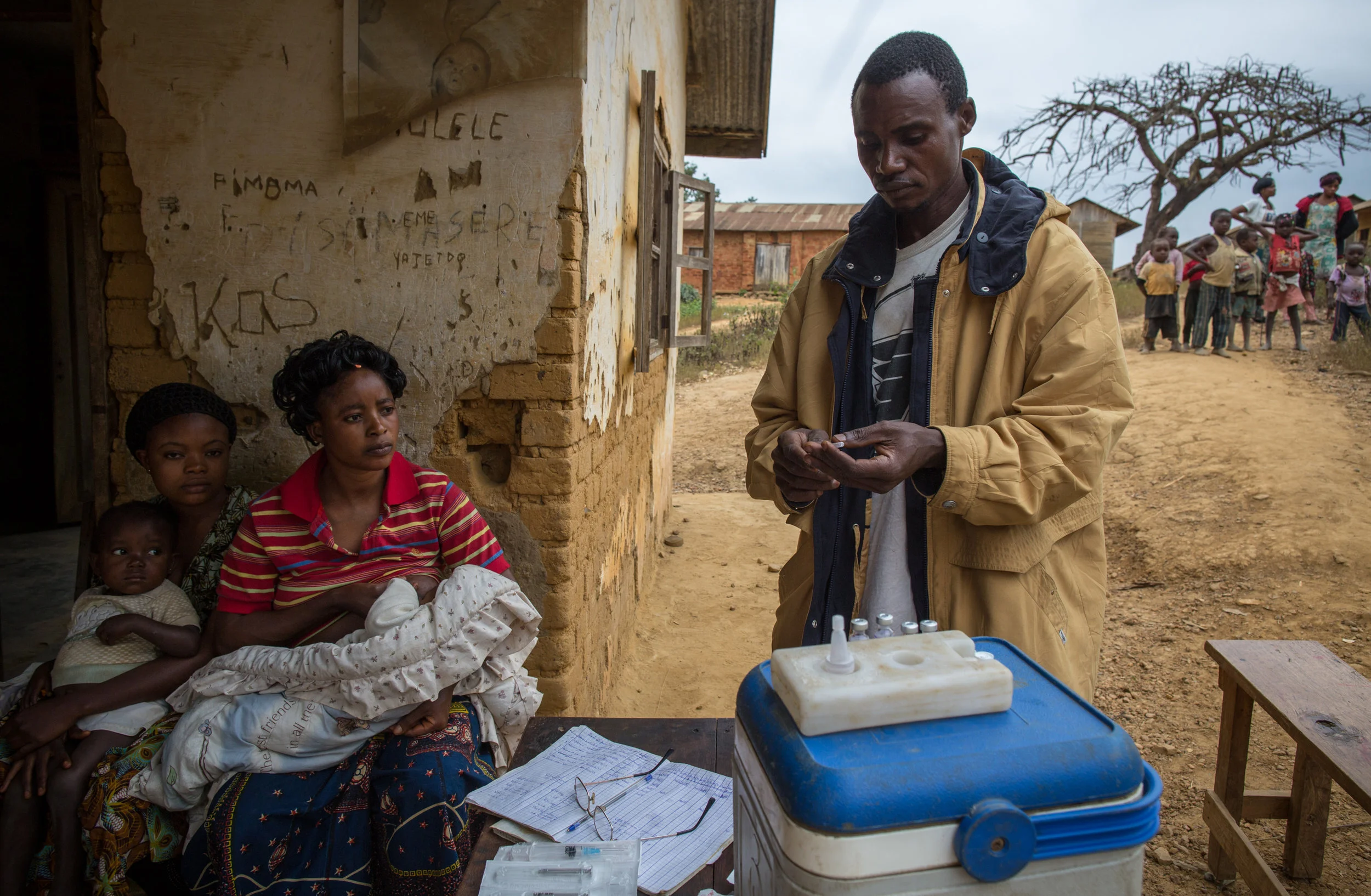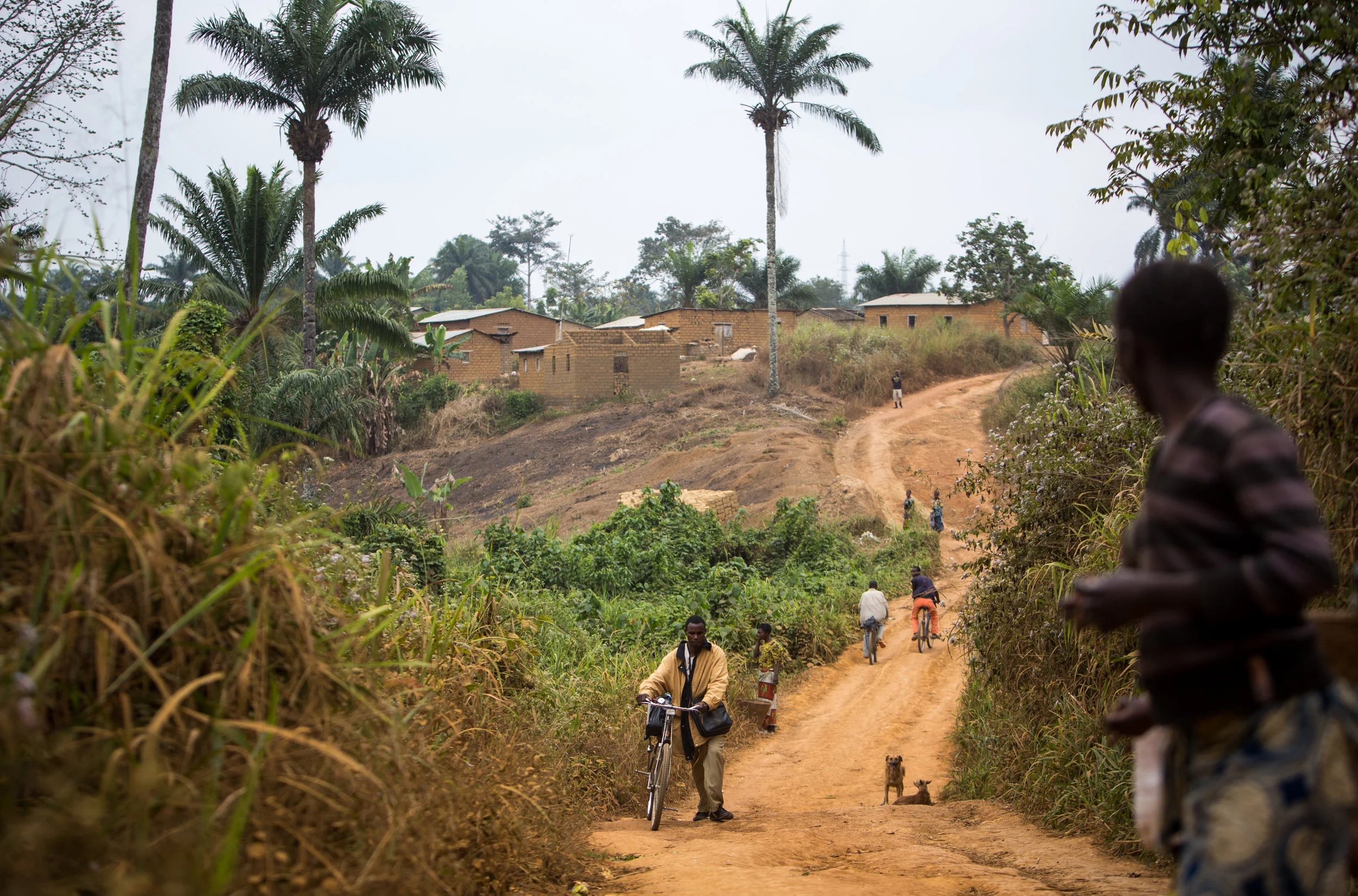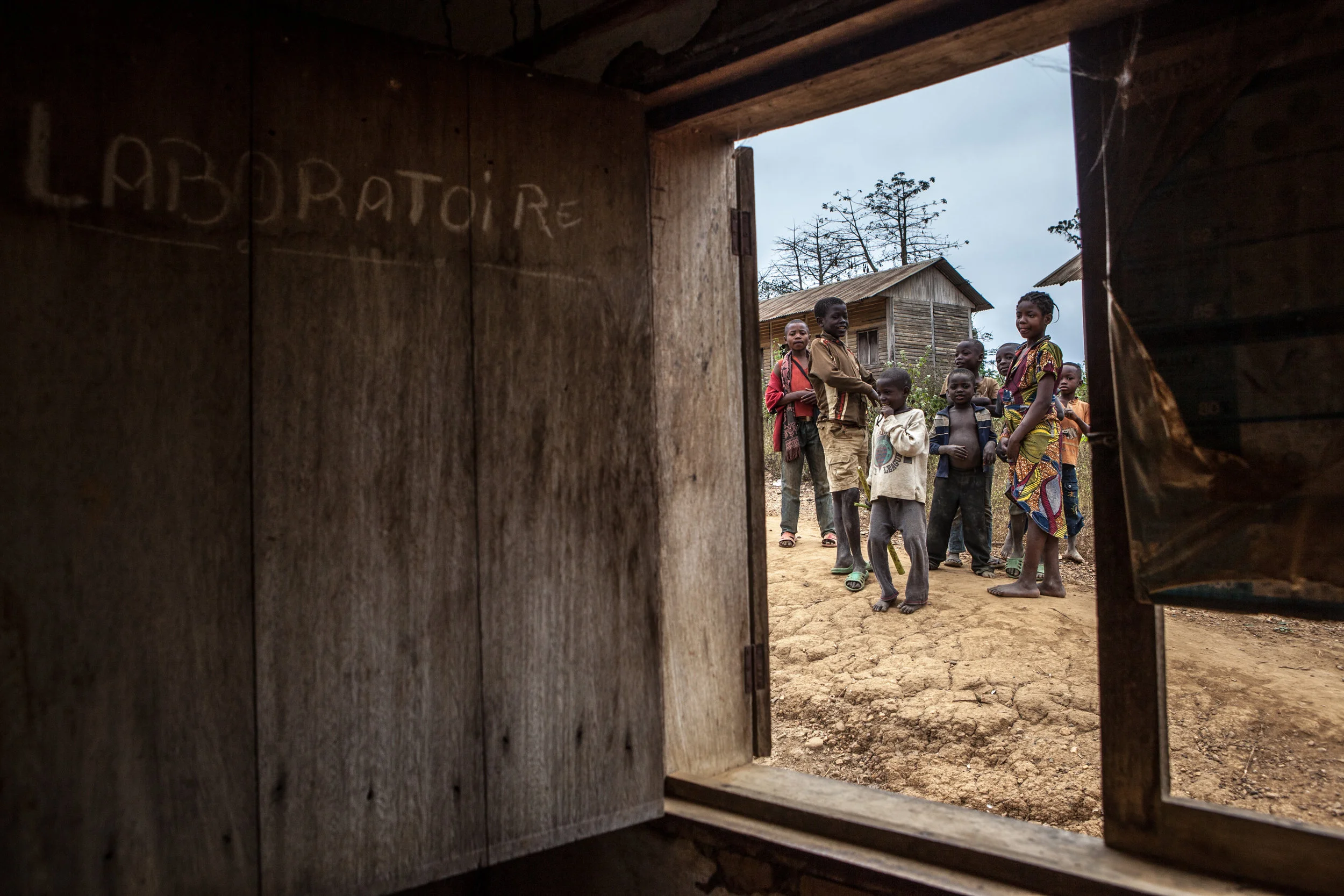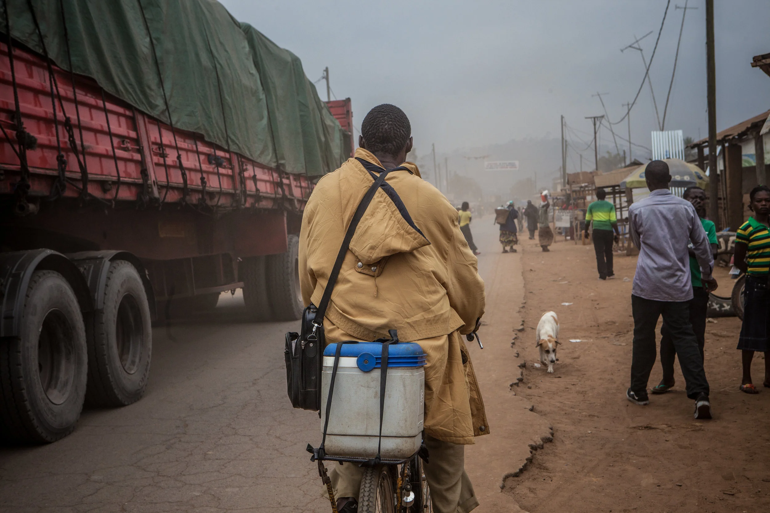 Setting out with a team from the Democratic Republic of Congo's Ministry of Health, I traveled to the city of Matadi, 300km from Kinshasa. The ever declining quality of the roads as we drove further from the capital meant the journey took eight hours. Bouncing over dusty, rough tracks, we stopped along the way at rural health centers, where solar-powered refrigerators are used to safeguard the vaccines which must be stored at a constant temperature. In these remote areas, one fridge stores enough vaccines to serve thousands of people. The next morning I met Jina Kiaku Mianfipa, a vaccinator in Kizulu Sanzi. Mr. Mianfipa would travel 50 kilometers on foot and by bicycle to deliver a cooler packed with vaccines to the village of Kinze Muété. I took pictures as I followed him over rutted dirt trails, at times too bumpy and steep to ride his bicycle, but he pressed on, pushing his bike and cooler past villagers laden with baskets and babies. He waved at children and neighbors, who smiled and laughed as I tried to keep up, running alongside Mr. Mianfipa trying to capture the spirit of his work with my camera – the remote landscape, the difficulty of his journey, and the people his exertions would help.