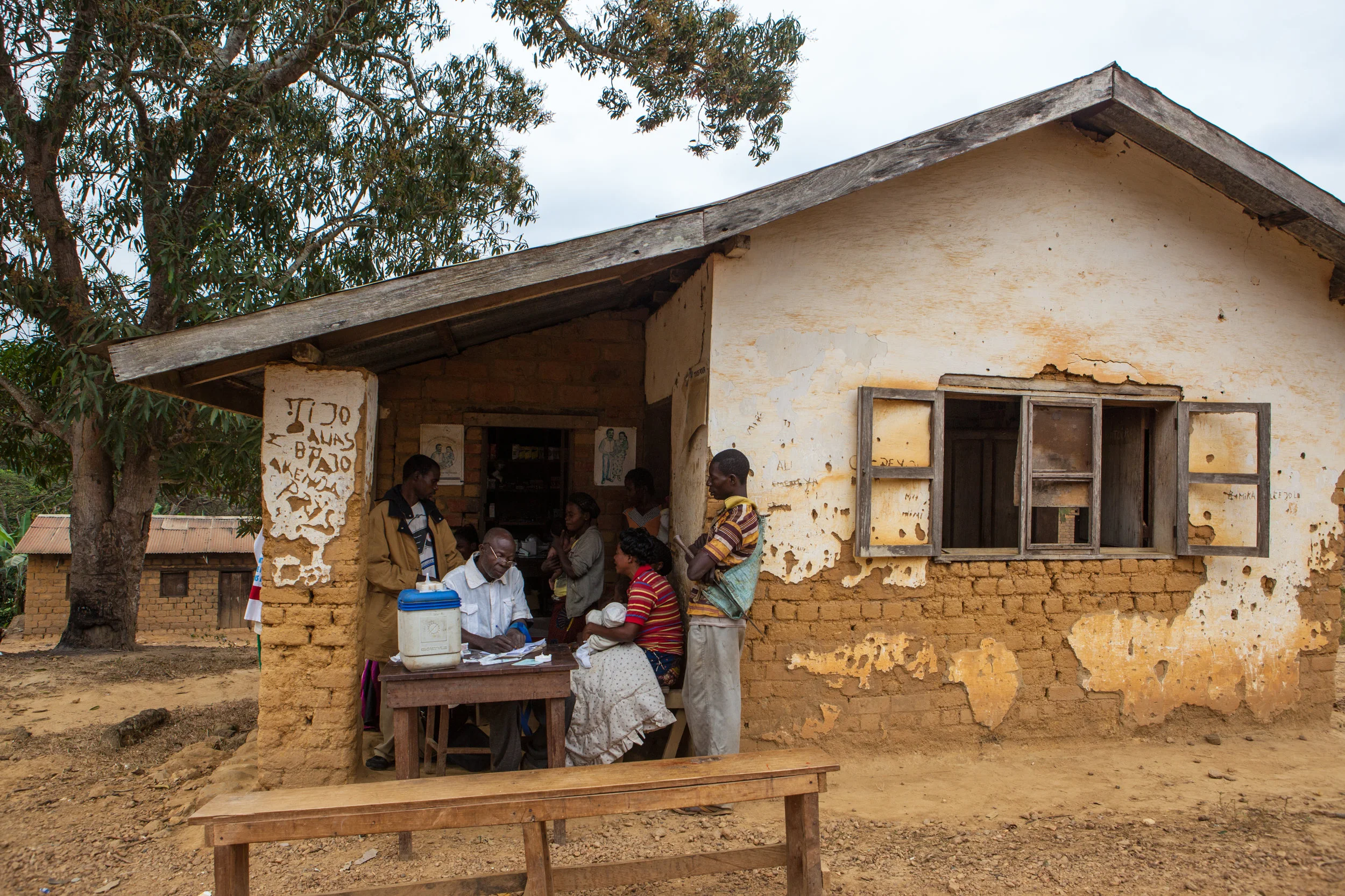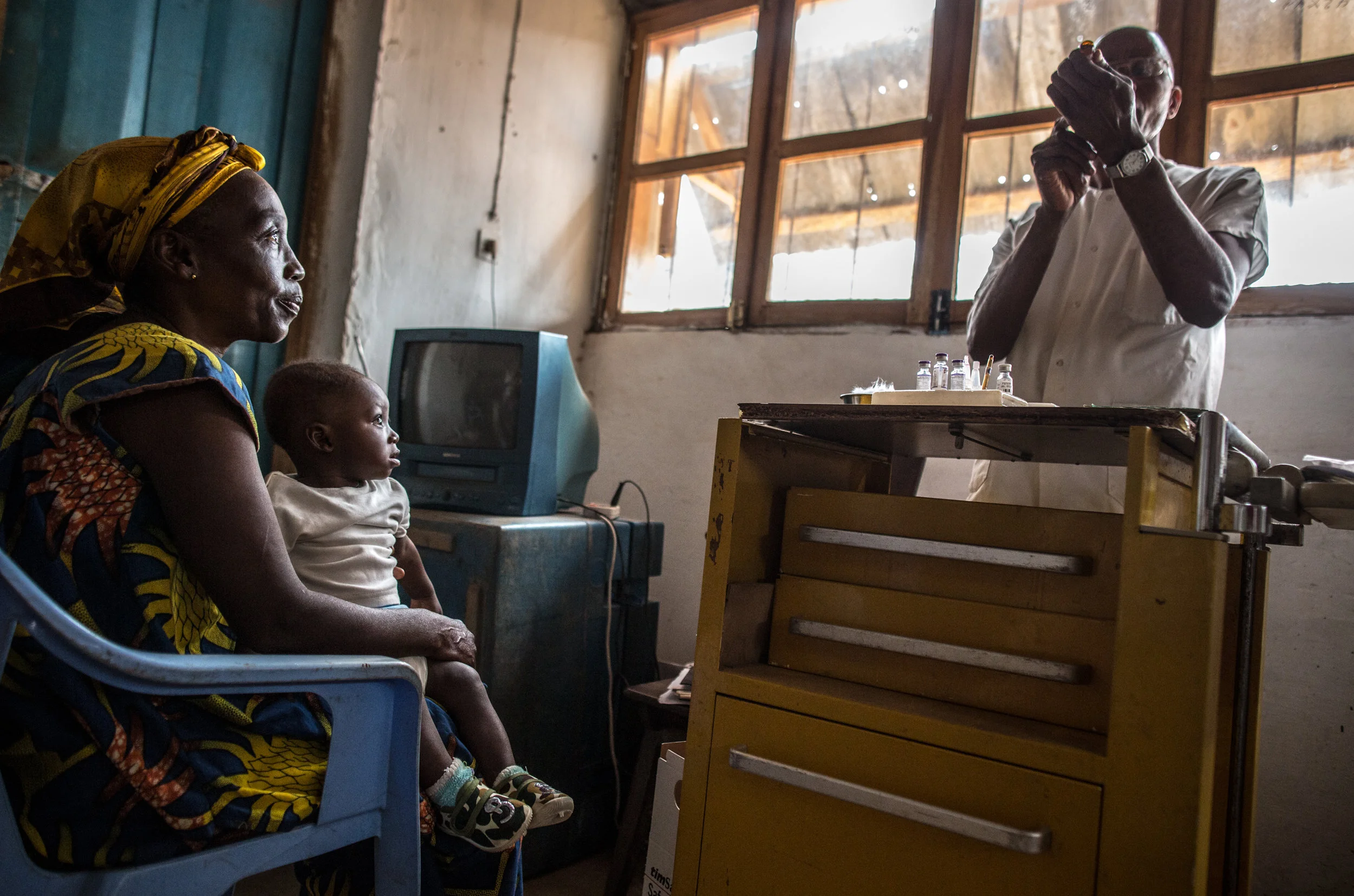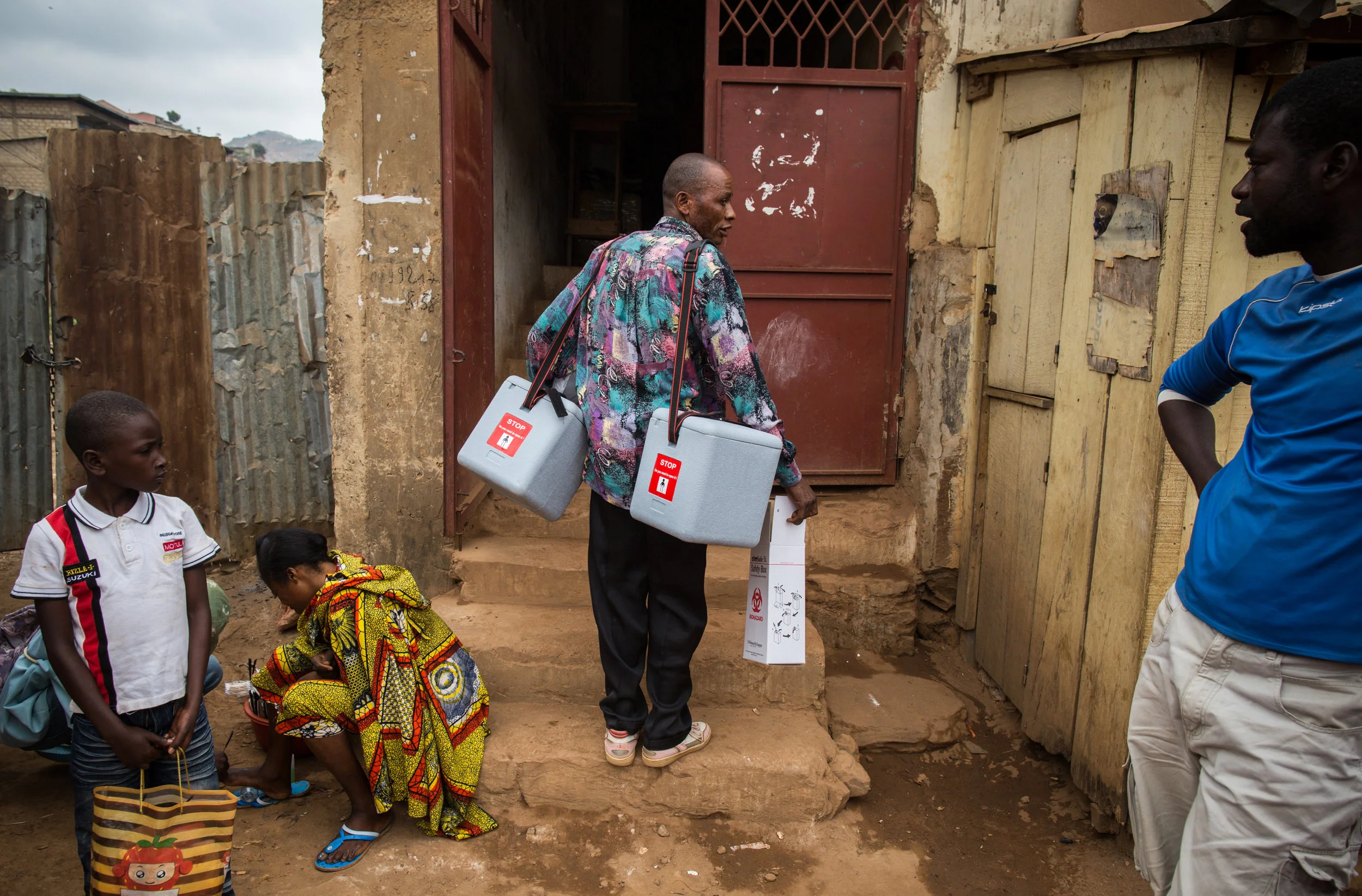 Setting out with a team from the Democratic Republic of Congo's Ministry of Health, I traveled to the city of Matadi, 300km from Kinshasa. The ever declining quality of the roads as we drove further from the capital meant the journey took eight hours. Bouncing over dusty, rough tracks, we stopped along the way at rural health centers, where solar-powered refrigerators are used to safeguard the vaccines which must be stored at a constant temperature. In these remote areas, one fridge stores enough vaccines to serve thousands of people. The next morning I met Jina Kiaku Mianfipa, a vaccinator in Kizulu Sanzi. Mr. Mianfipa would travel 50 kilometers on foot and by bicycle to deliver a cooler packed with vaccines to the village of Kinze Muété. I took pictures as I followed him over rutted dirt trails, at times too bumpy and steep to ride his bicycle, but he pressed on, pushing his bike and cooler past villagers laden with baskets and babies. He waved at children and neighbors, who smiled and laughed as I tried to keep up, running alongside Mr. Mianfipa trying to capture the spirit of his work with my camera – the remote landscape, the difficulty of his journey, and the people his exertions would help.